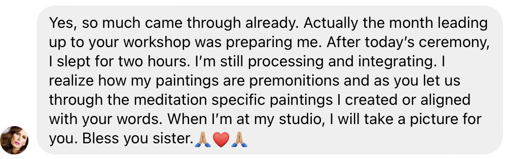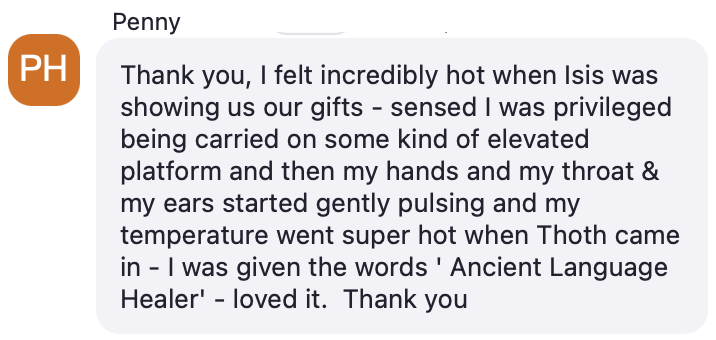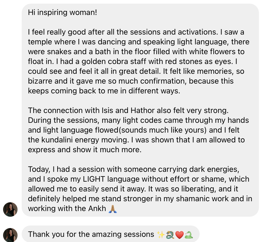 “Thank you Jessica, my higher self, Spirits, Goddess and Gods for coming through and helping me to remember my deep essence and path in this life. I had many memories come up from my time in Egypt and my role in ancient civilizations. I know I am here the birth and support the presence, remembrance and rising of the sacred sensual feminine in order to hold a safe container for the sacred masculine to awaken. This will align a divine harmonic frequency balance in order to bring Christ consciousness and magick back to Gaia to bridge our worlds. Thank you so much, I love who you are and what you do- absolutely beautiful and profound. ”