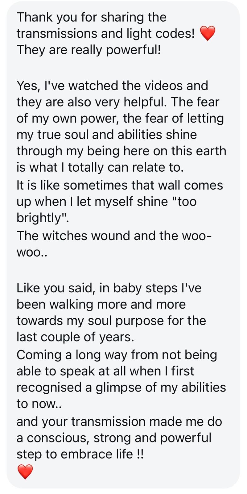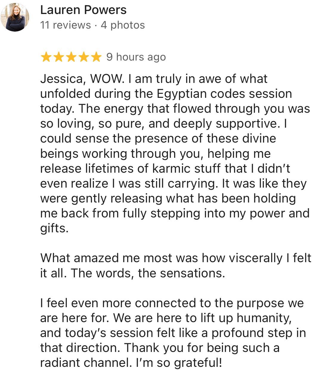 The energy that flowed through you was so loving, so pure, and deeply supportive. I could sense the presence of these divine beings working through you, helping me release lifetimes of karmic stuff that I didn’t even realize I was still carrying. It was like they were gently releasing what had been holding me back from fully stepping into my power and gifts. What amazed me most was how viscerally I felt it all. The words, the sensations. I feel even more connected to the purpose we are here for. We are here to lift humanity, and today’s session felt like a profound step in that direction. Thank you for being such a radiant channel. I’m so grateful!"