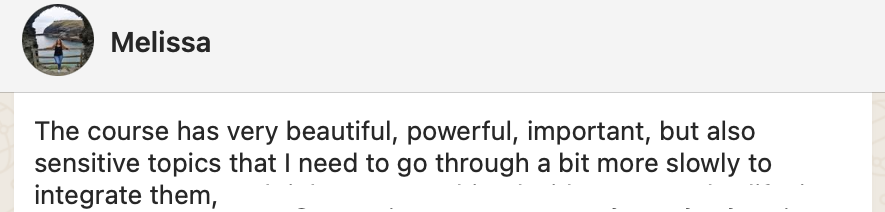 After finishing the course, my feelings of infinite sadness, loneliness and abandonment have improved greatly. I now have a better understanding of myself and my life’s journey, and I am able to trust life and also myself.